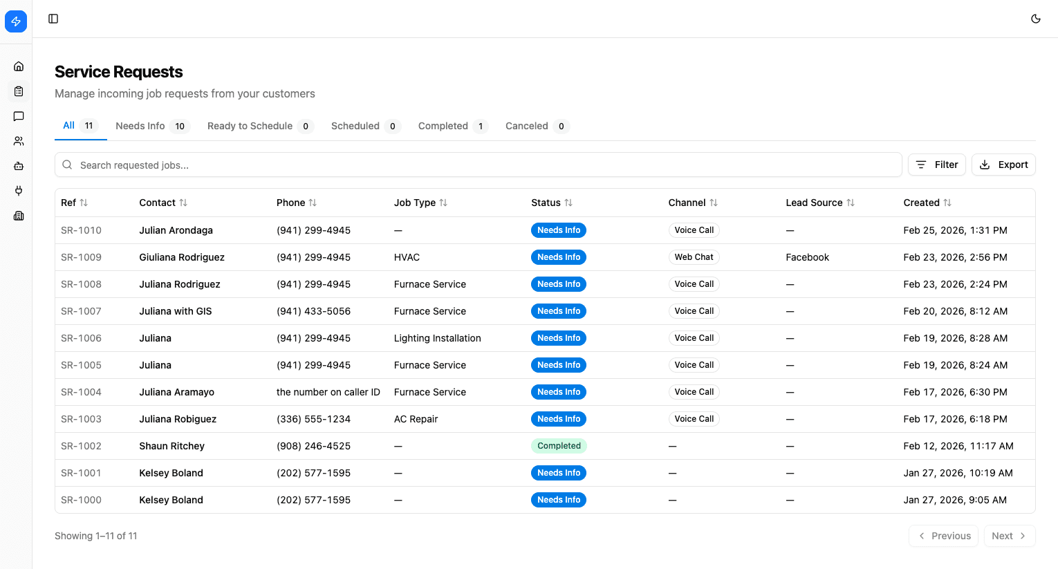 Instead of sorting through missed calls every morning, your team sees structured service requests already created in Breezy.