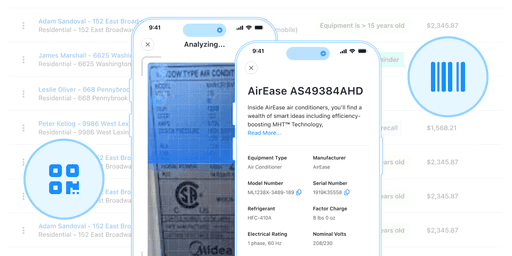 Scan data plates to pull equipment data and add it to the customer's profile.